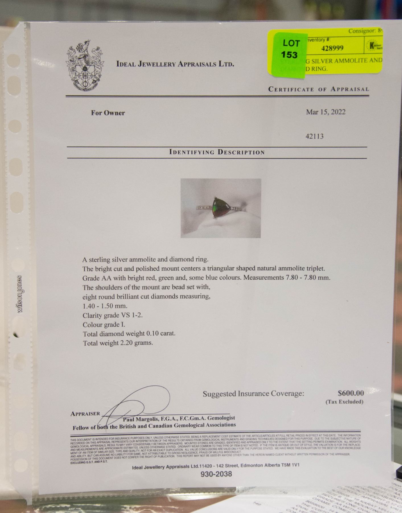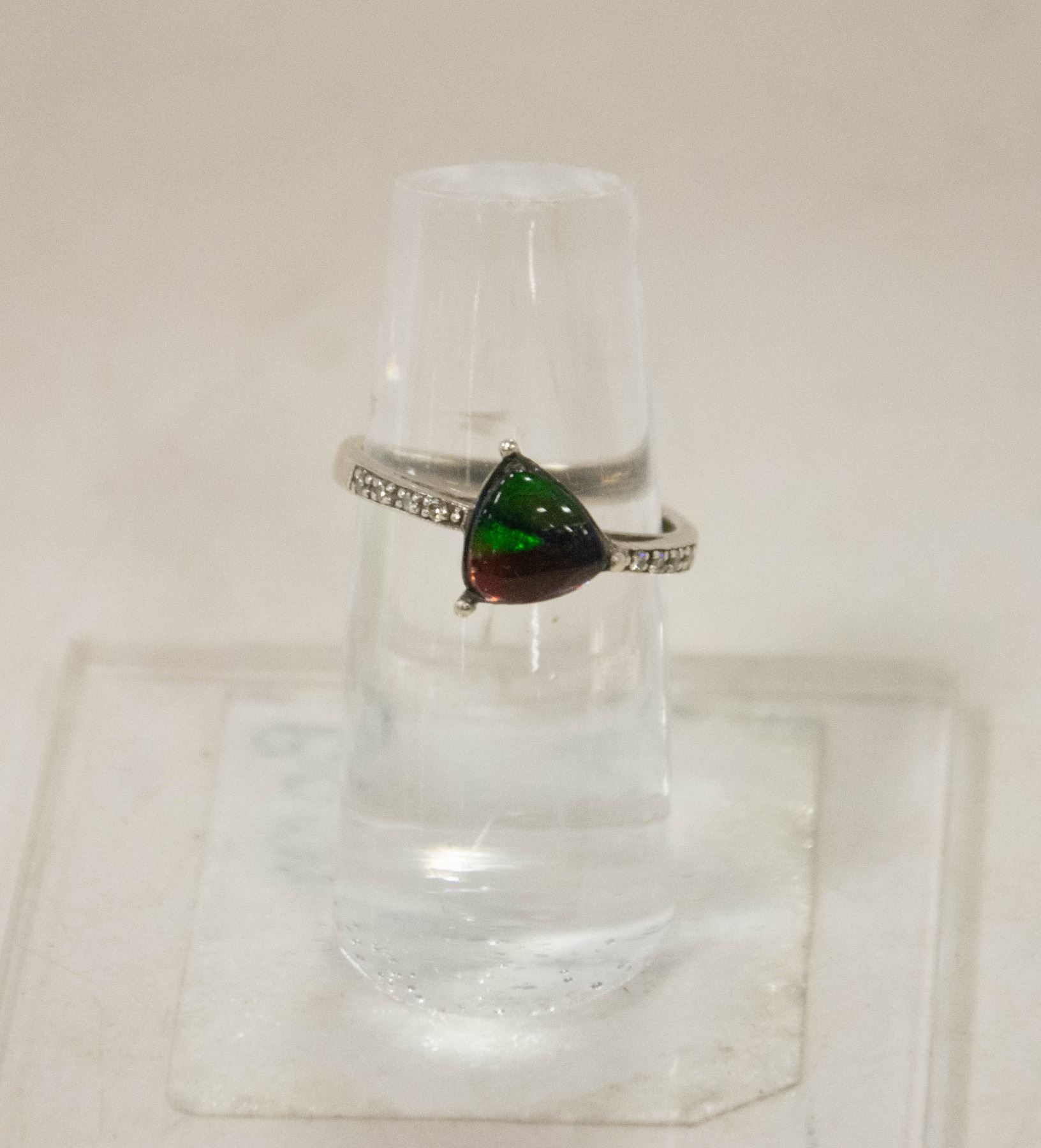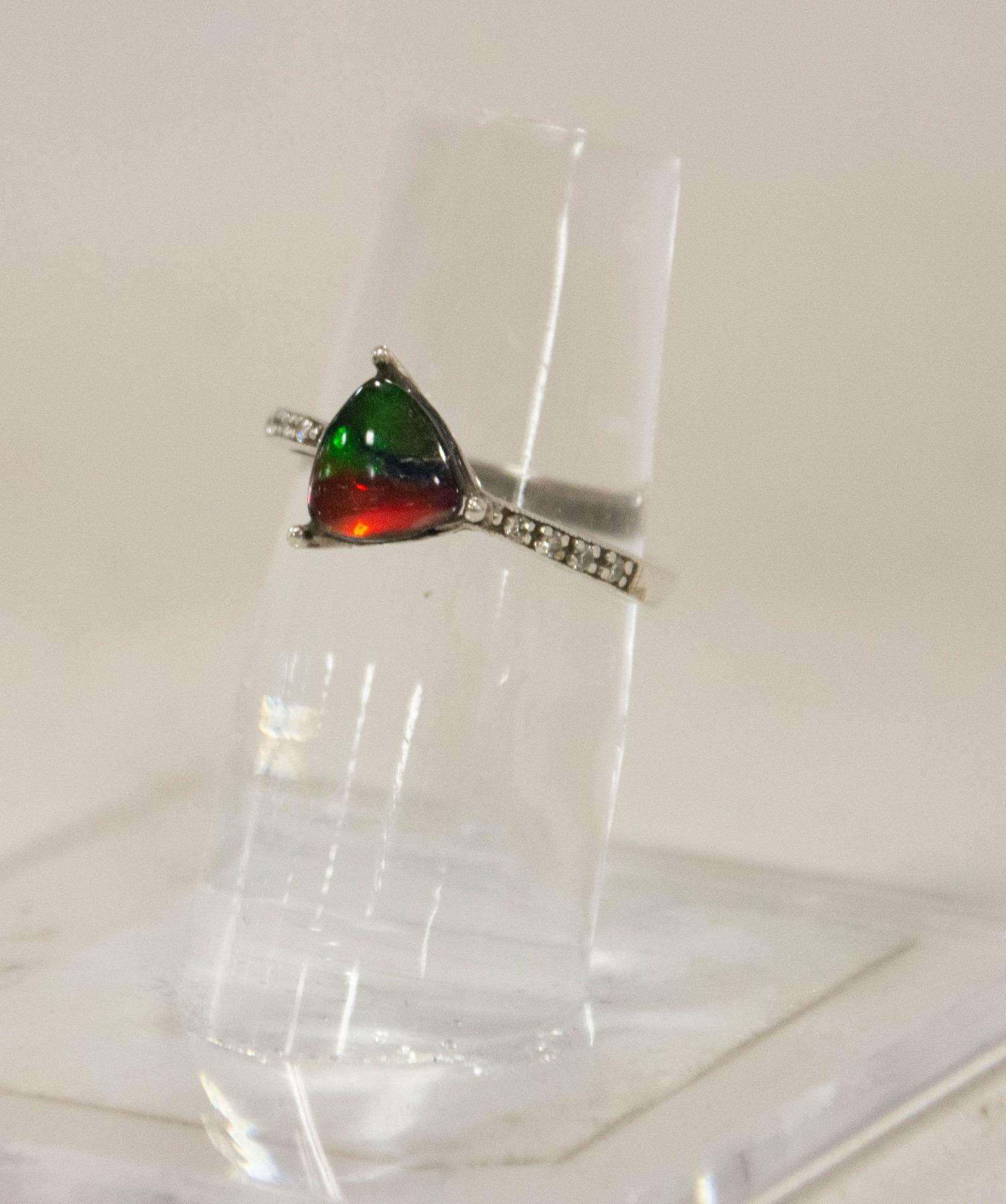 BRIGHT CUT POLISHED MOUNT CENTERS A TRIANGULAR SHAPED NATURAL AMMOLITE TRIPLET. GRADE AA WITH BRIGHT RED, GREEN, AND SOME BLUE COLOURS. MEASUREMENTS 7.80-7.80mm. THE SHOULDERS OF THE MOUNT ARE BEAD SET WITH EIGHT ROUND BRILLIANT CUT DIAMONDS MEASURING 1.40-1.50mm. CLARITY GRADE VS 1-2. COLOUR GRADE I. TOTAL DIAMOND WEIGHT IS 0.10 CARATS TOTAL WEIGHT 2.20 GRAMS. APPRAISED $600.00