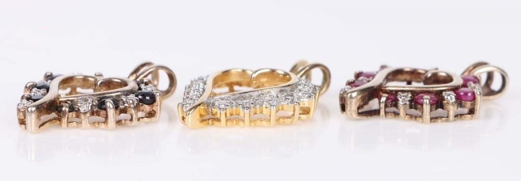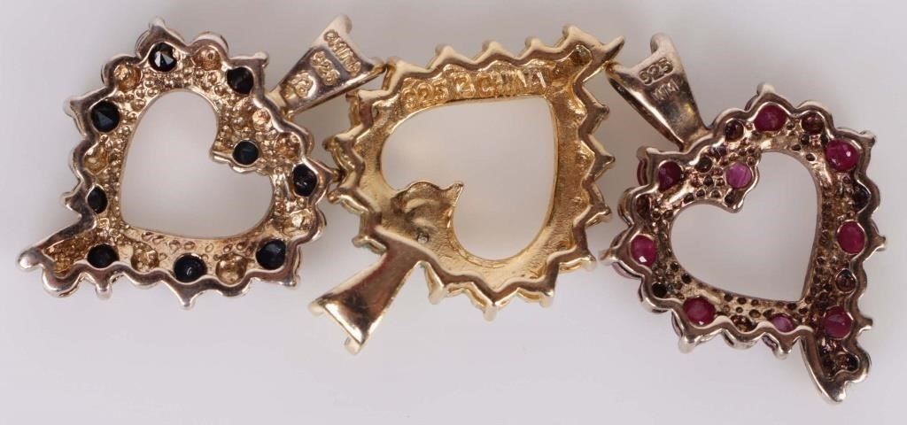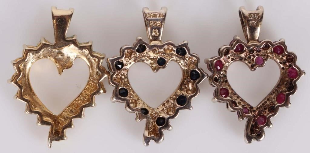 Sterling silver assorted gem heart pendants to include one Ruby sterling pendant w/ seven 0.04ct round cut rubies, and two 0.02ct round cut rubies, one blue sapphire sterling pendant w/ seven 0.04ct round cut blue sapphires, and two 0.02ct round cut blue sapphires, and one sterling silver heart pendant.