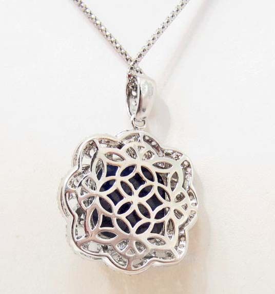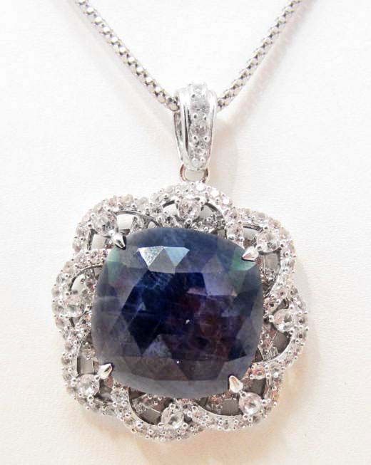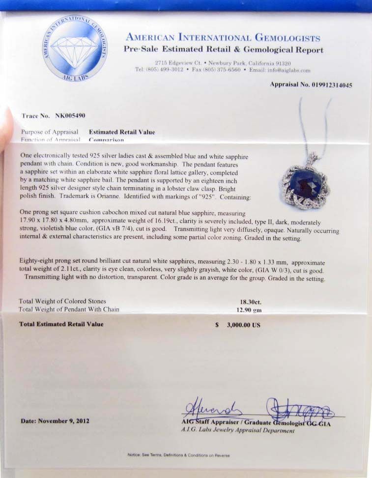 One prong set square cushion cabochon mixed cut natural Blue Sapphire center stone 16.19 cts. 88 prong set round brilliant cut natural White Sapphires 2.11 cts. Total Weight 12.90 grams. Appraised Value $3,000.00