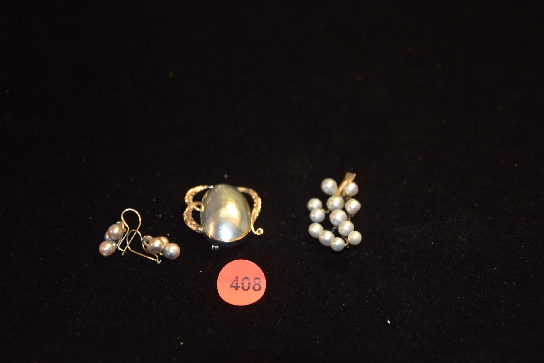 STERLING SILVER BLUE PEARL BROOCH & UNMARKED SILVER BLUE PEARL PIN & EARRINGS (3 PCS)