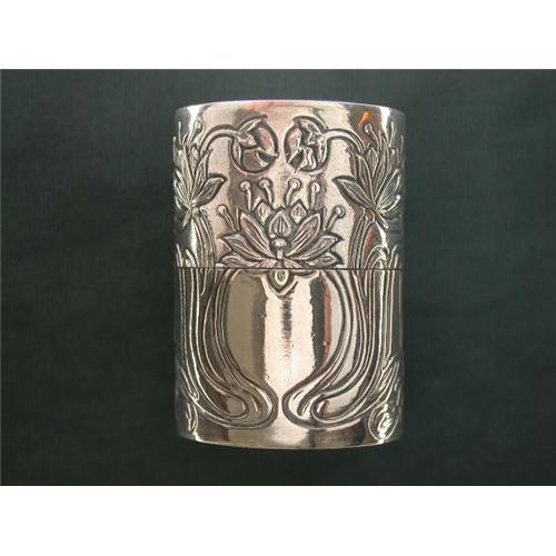 You can use this STERLING SILVER cylindrical Box for your thread, thimble, pills, or whatever you wish! It is in the Art Nouveau Style and it measures 1 1/2" in height. It is in Mint condition.
