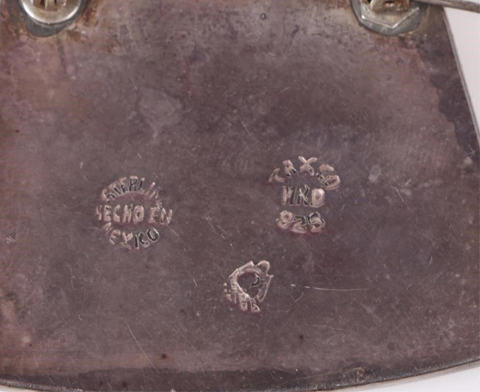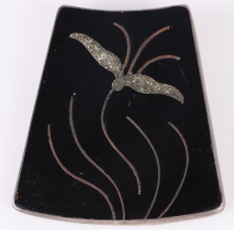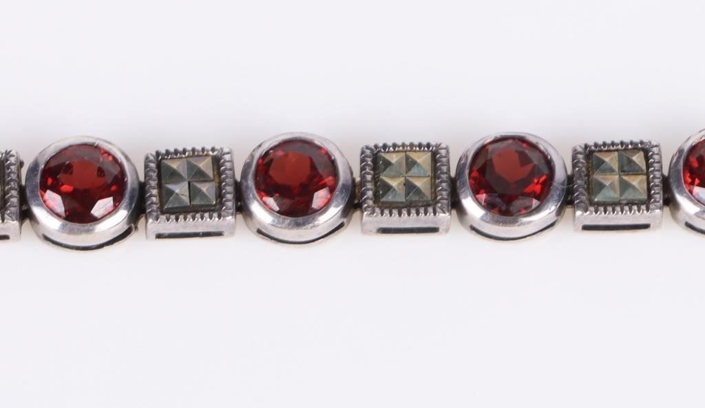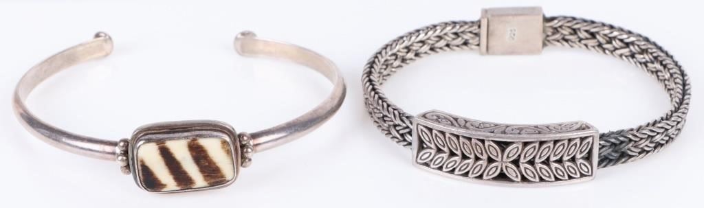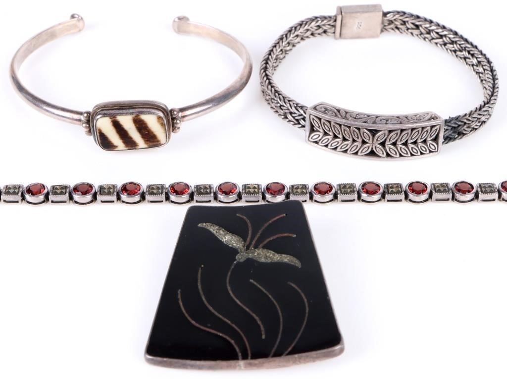 Sterling silver bracelets and brooch - lot of 4. Jewelry includes one Mexico Taxco sterling silver onyx floral brooch, one inset bone bracelet, one chevron bracelet, and one garnet bracelet.