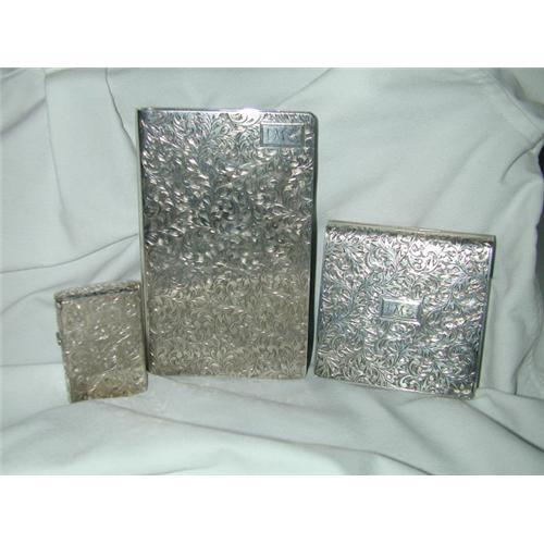 Stunning 3 piece sterling silver set all fully engraved/chased in original box: Card/cigarette case, cigarette lighter, and compact for loose powder. Each is monogramed IMS done in an Asian type font which is quite sophisticated! Original wooden box lined in pastel yellow, no lid. Both of the larger cases are marked "silver 950" and the lighter case is marked "sterling." Almost in pristine condition with the cigarette case having one small indention and the mirror of the compact having a few tiny faint dots. These are quite minor and are mentioned for accuracy purposes and in noway detract from the majesty of these cases!!