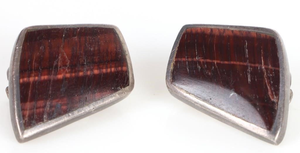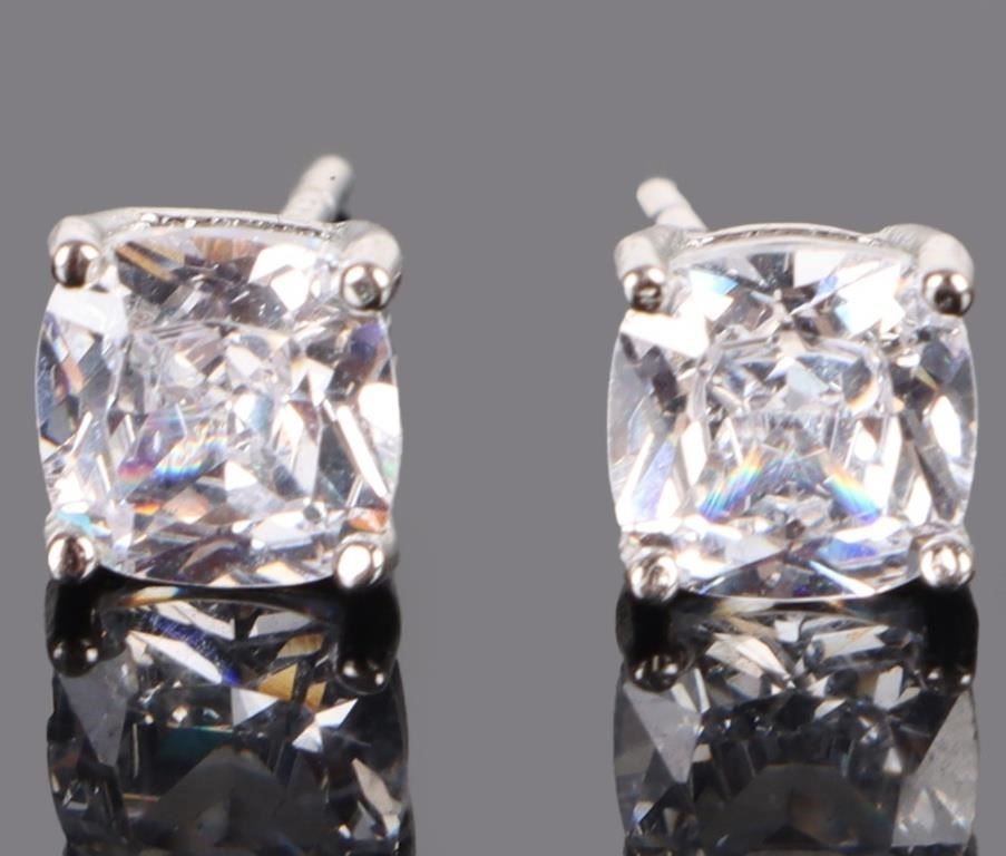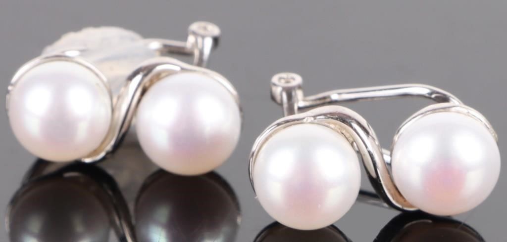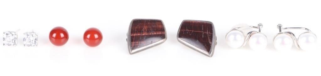 Sterling silver collectible ladies earrings to include one pair of faux pearl clip-on earrings, one pair of inset stone earrings, one pair of beaded jasper earrings and one pair of CZ ladies earrings.