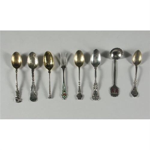 STERLING: A lot of eight assorted sterling silver demitasse spoons and one olive fork, some gold washed, one is European sterling 800, all hallmarked, both pattern and souvenir styles, pickle fork is Canadian with enamel.