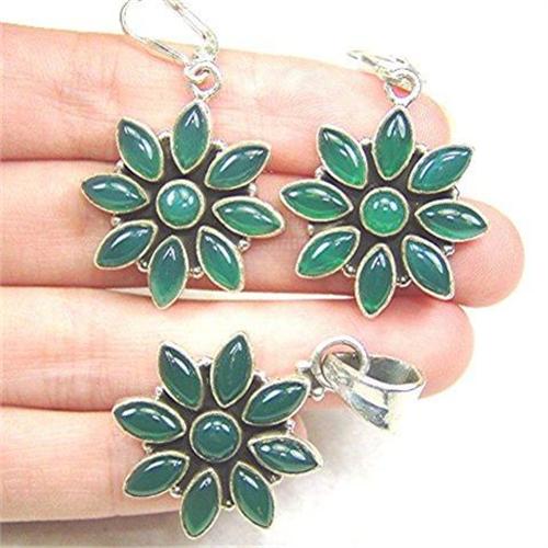 <p>This is a MATCHED SET of earrings and a pendant featuring a gorgeous flower motif in genuine GREEN ONYX. Set on heavy gauge sterling silver, this gorgeous green trio is meant to give you lasting pleasure whenever you wear it. BREATHTAKING...