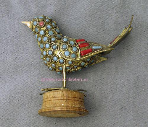 STERLING SILVER FIGURAL BIRD SCULPTURE DECORATED WITH TURQUOISE AND CORAL STONES AND SITTING ON A WOODEN BASE. VERY UNIQUE. 24.8 GRAMS.