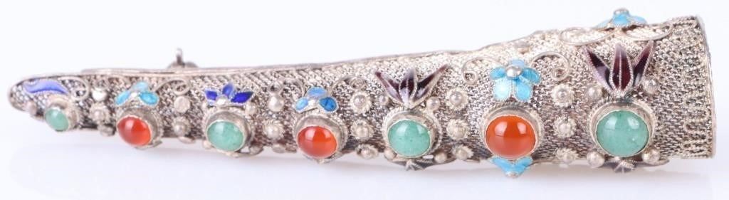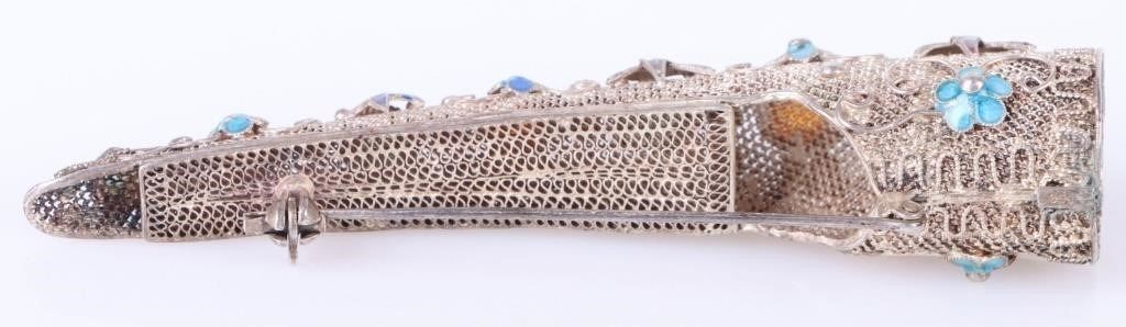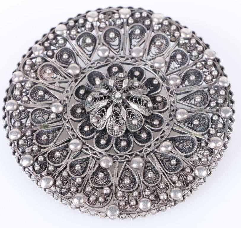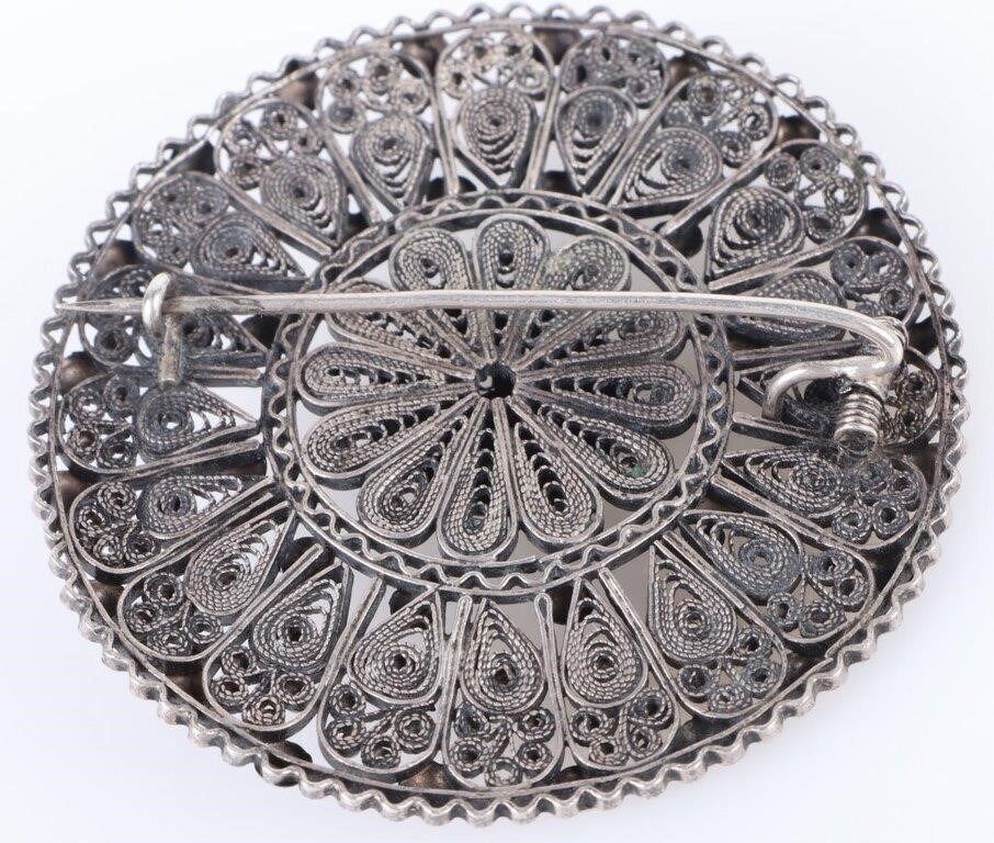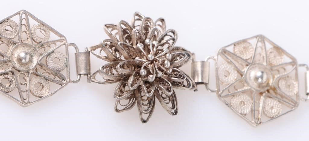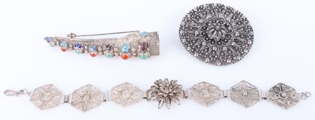 Sterling silver filigree Jade ladies jewelry to include: one jade-inset brooch, one floral brooch and one floral bracelet.