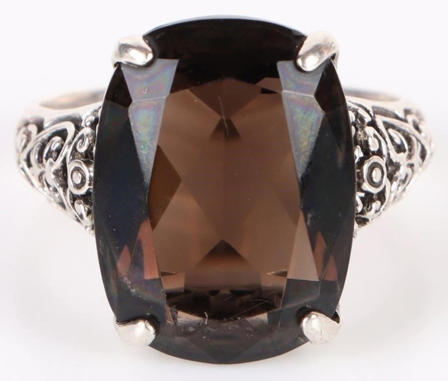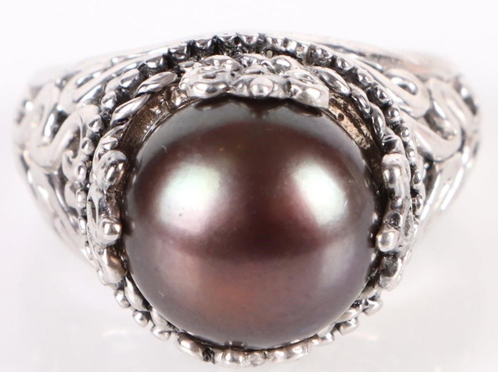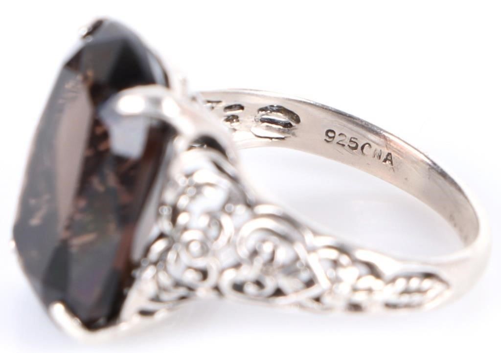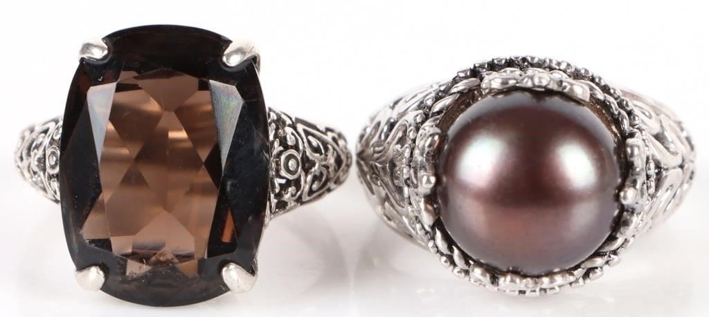 Sterling silver filigree ladies rings lot of 2 to include: 3.5CT Princess cut Smoky Quartz filigree ring size 6, 10.87mm Black Pearl filigree ring size 6.
