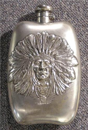 STERLING SILVER FLASK with Native American in full headress, 8" high, condition: excellent. packing and shipping w/in continental USA (excluding insurance) $25