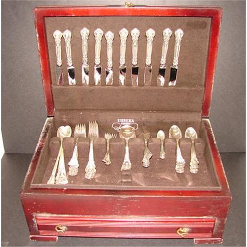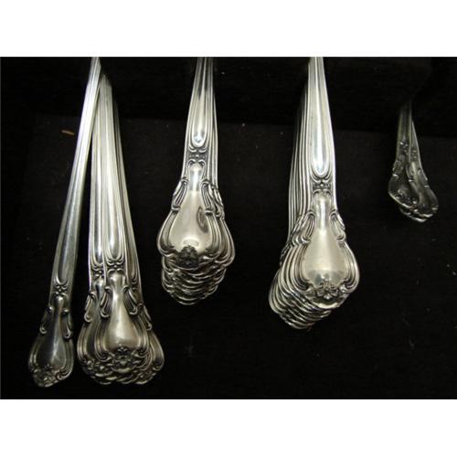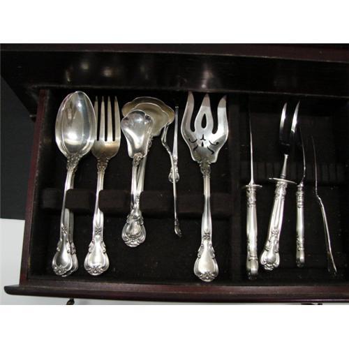 87 PIECES OF STERLING SILVER FLATWARE. Consists of 8 iced tea spoons (7.5” L), 10 salad forks (6.5” L), 10 dinner forks (7” L), 3 pickle forks (5.5” L), 8 soup spoons (6.25” L), 8 butter knives (6” L), 8 demitasse spoons (4” L), 22 spoons (5.75” L), and 10 dinner knives (8.75” L). All pieces are marked Sterling. Flatware is housed in silverware container.