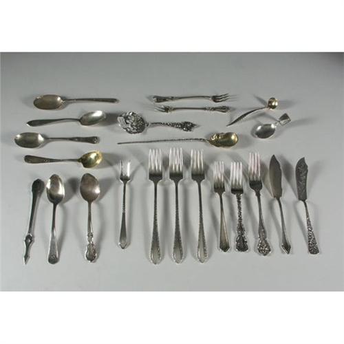 STERLING: A lot of twenty-two assorted sterling silver including forks, spoons and serving pieces, 6 spoons suffer damage, two are gold washed, most clearly hallmarked, 4.80 ozt., excluding three gold washed pieces.