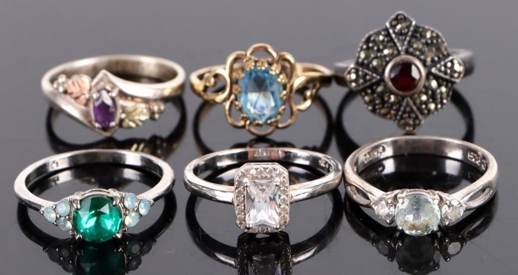 Sterling silver gemstone ladies rings to include aquamarine, topaz, emerald, cubic zirconium, garnet, and amethyst. Lot of 6.