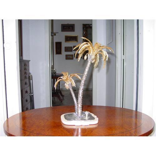 THIS IMPRESSIVE ONE OF A KIND STERLING SILVER/GILT DATE PALM FIGURINE DESERVES A POSITION OF PROMINENCE, IT IS UNIQUE IN THE FACT THAT THE GILDED FRONDS ARE REMUVABLE FOR THE EASE IN CLEANING; THE FRUIT ARE GILDED AS WELL. EACH FROND & FRUIT IS MINUTELY DETAILED FOR A REALISTIC LOOK & FEEL. THE BARK IS INDIVIDUALY DONE TO MIMIC THE NATURAL LOOK OF THE DATE PALM IN THE WILD. THIS FIGURINE SITS ON AN ACRYLIC BASE & CONSISTS OF TWO INDIVIDUAL PALM TREES; IT WOULD MAKE A LOVELY ACCENT TO YOUR OFFICE, HOME, ISLAND VACATION VILLA, OR YACHT.<p>