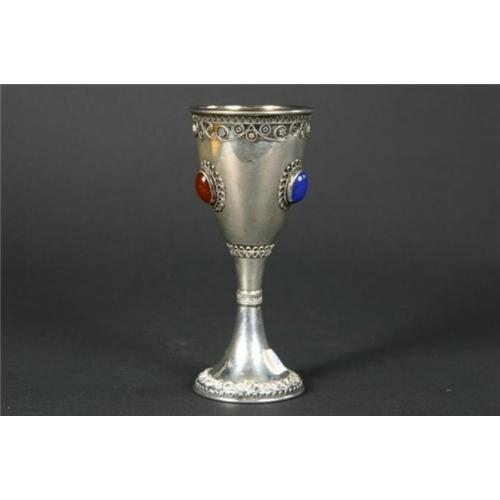 This sterling silver goblet is a wonderful example of an Arts and Crafts style with highly decorated wire scroll work on the lip, the stem and the goblet has a beautiful gilt interior and is adorned with three stones or cabachon, agate, lapis and the 3rd stone could be a green chalcedony. This goblet could have also been used as a kiddish cup. No makers marks. c. 1900. In very good condition with tiny tarnish, minor scratching, normal wear.
