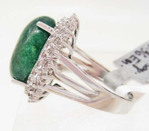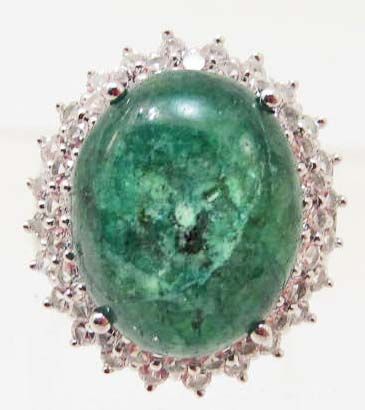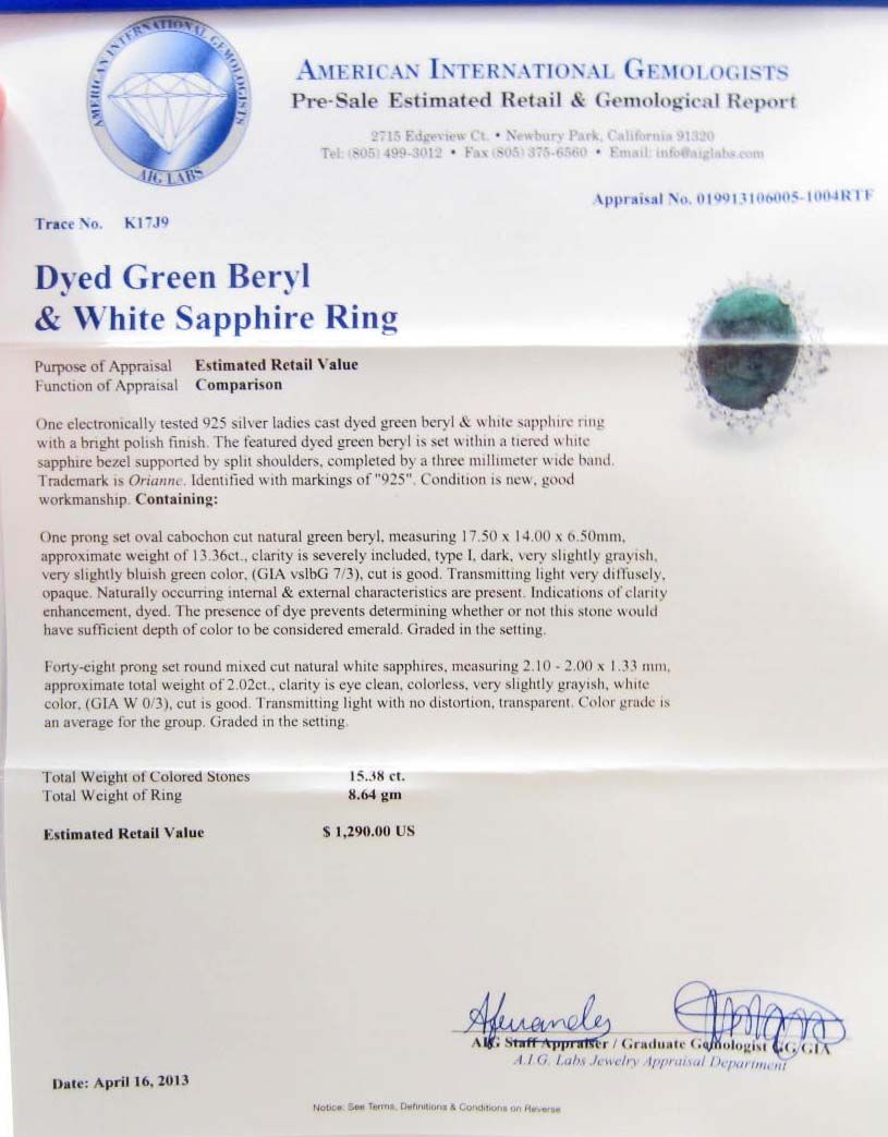 One prong set oval cabochon cut natural Green Beryl 13.36 cts. 48 prong set round mixed cut natural White Sapphires 2.02 cts. Total Weight 8.64 grams. Appraised Value $1,290.00