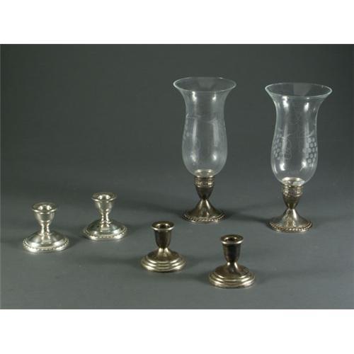 STERLING SILVER SILVER: A six-piece lot of assorted Sterling Silver including a matching pair of hurricane candlesticks with grape etched original clear glass shades, candleholder has a reticulated top and embossed rim, 3 7/8'' H, 11'' H with shade, Duchin Creations, minor dents around base, chip noted to hurricane shade. A pair of weighted sterling silver candle holders with gadroon edge by La Pierre Manufacturing Company, New York 1888-1929, purchased by International Silver, trademark ''L'', 3 1/8'' H, some pitting noted. A pair of weighted Revere Sterling Silversmiths candleholders, base being made with stair stepped ring indentations, 3'' H, flea bite indentations around the base, as seen.