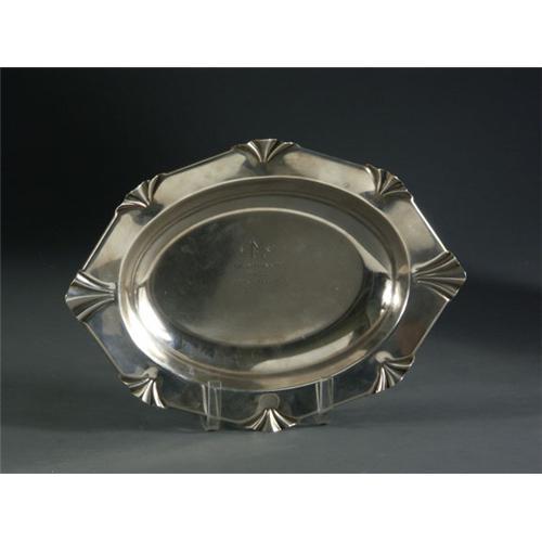 STERLING: Cmmemorative oblong octagon shaped sterling tray. Deco Styling, having an indented center inscribe with the words, ''G.M.C. Championship, 1933 First Flight'', hallmarked Sterling, Preisner Silver Company?, 11 «'' L x 8 3/8'' W . Note: Condition is good with normal rub marks commensurate with age.