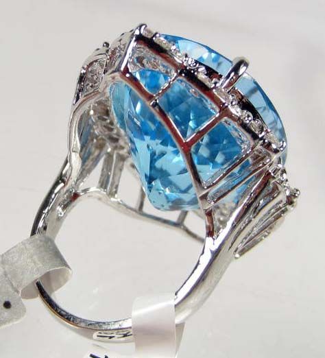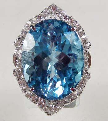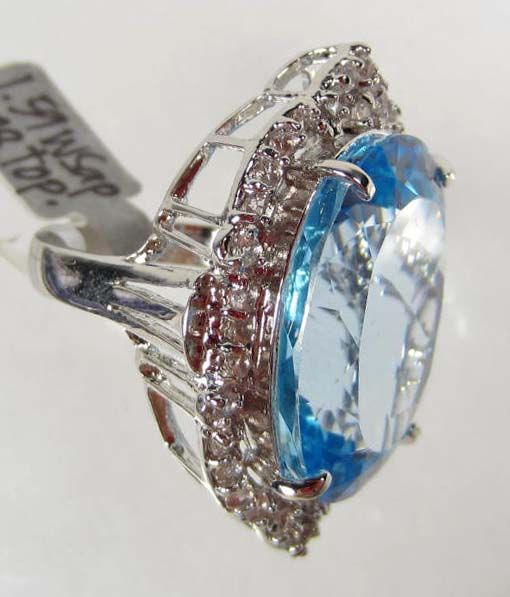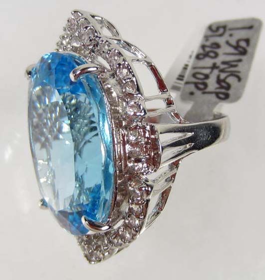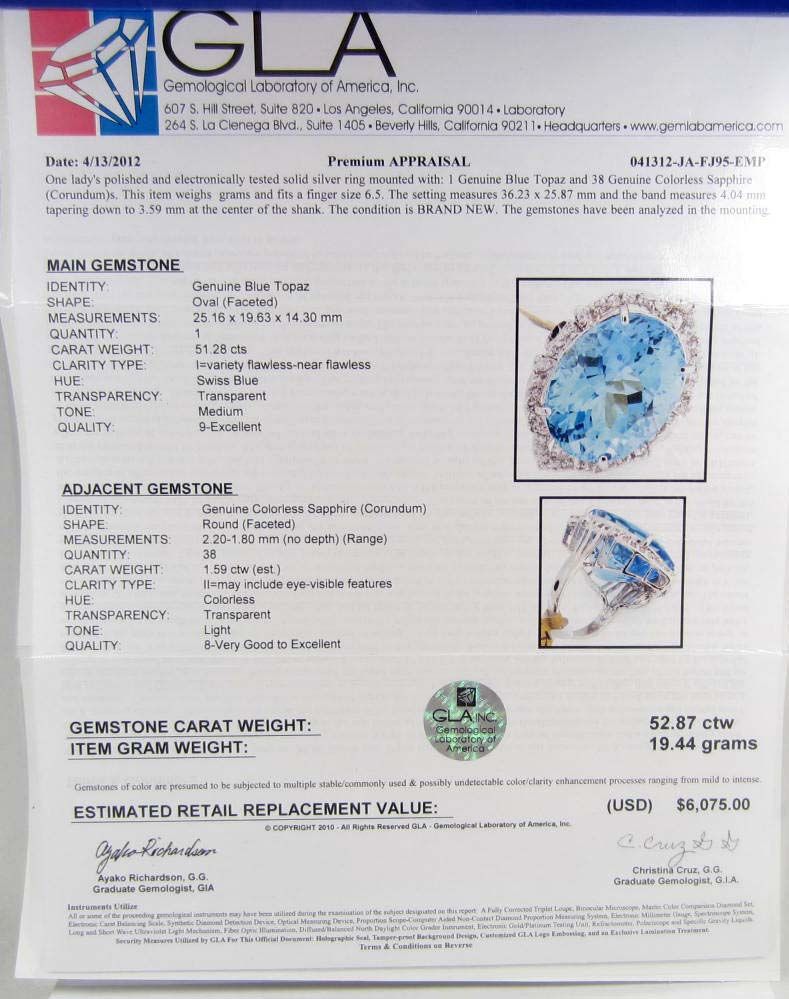 Comes w/ GLA Appraisal of $6,075.00. One oval Blue Topaz center stone. 38 round colorless Sapphires. Topaz 51.28 cts, Sapphires 1.59 cts. Total Weight 19.44 grams.