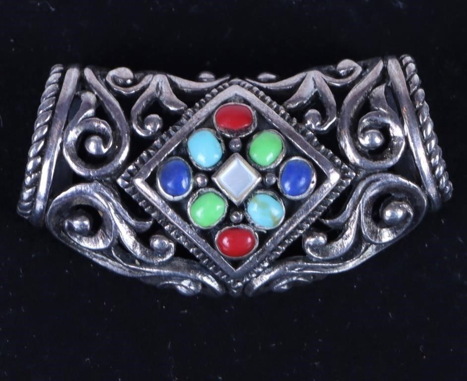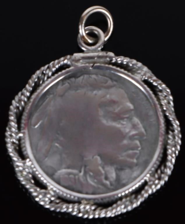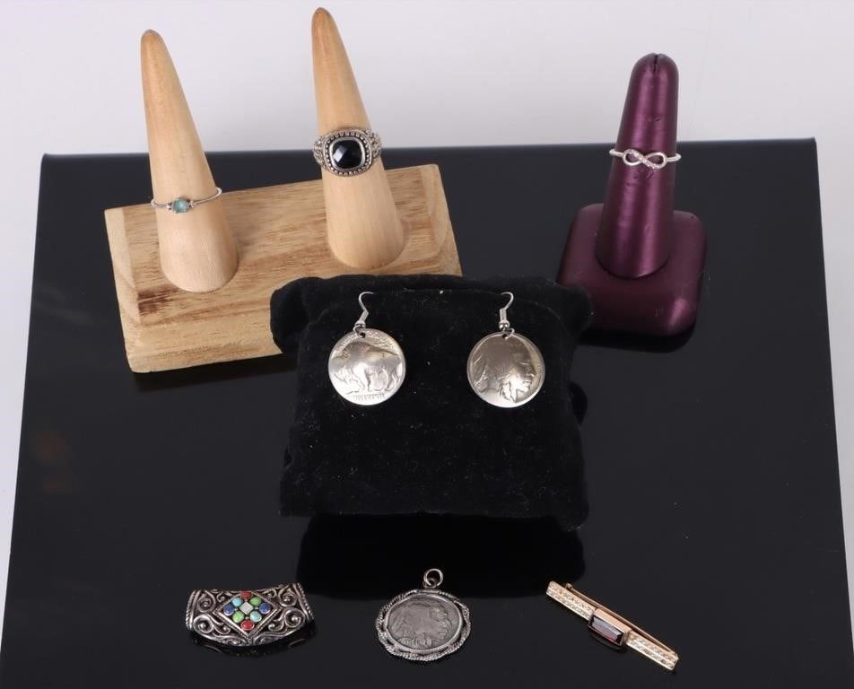 Sterling silver ladies collectible jewelry to include one pendant, one brooch, one buffalo nickel earrings and matching pendant, and three rings.
