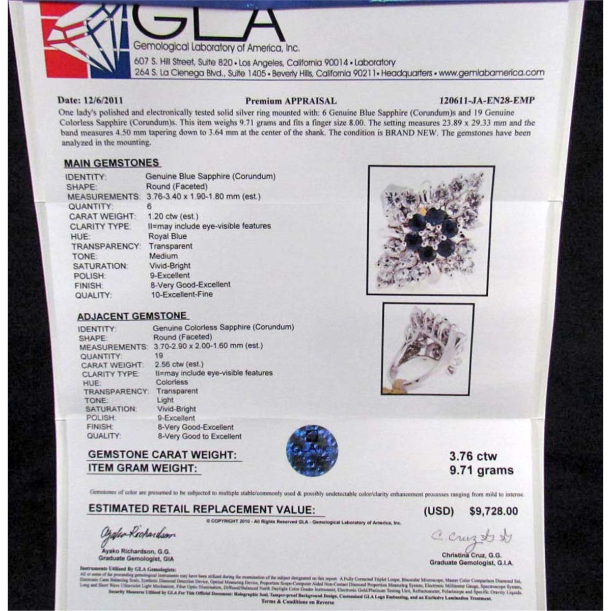 Comes w/ GLA Appraisal of $9,728.00. 6 round Bluee Sapphires. 19 Round Colorless Sapphires. Sapphires 3.76 cts, Total Weight 9.71 grams.