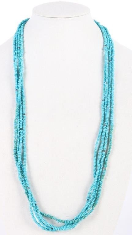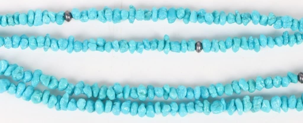 Sterling silver-clasped large turquoise four-strand chip necklace.