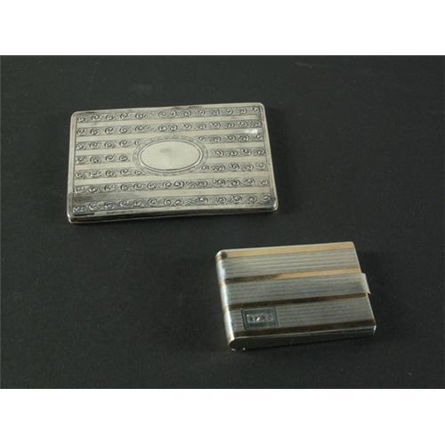 STERLING ACCESSORIES: A sterling silver double sided hinged picture frame 2 «'' x 3 «'', with an interior having a double-sided oval shaped frame, embossed floral trim, the outside is a series of rows of embossed filigree with oval centers, one of which is monogrammed. Unidentified hallmark, early 20th century. Note: One inside frame edge is torque but overall good condition. A sterling silver match hinged matchbook cover, gold alternating stripping with etched lines and monogrammed,2 ¬'' x 1 5/8''. Note: Condition is good.