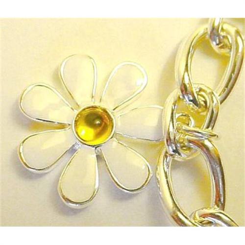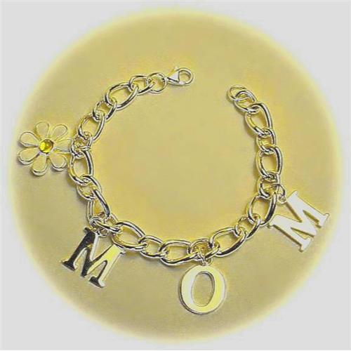 SOLID STERLING SILVER CHARM BRACELET READS "MOM" AND FEATURES AN ENAMELED DAISY IN WHITE AND YELLOW. NICE HEAVY LINKS AND CHARMS MAKE THIS A RICH, 23 GRAM BRACELET WHICH MEASURES 7 INCHES IN LENGTH. AS SEEN ON QVC AT $47.25.<BR><P><b>=================================================================================================
