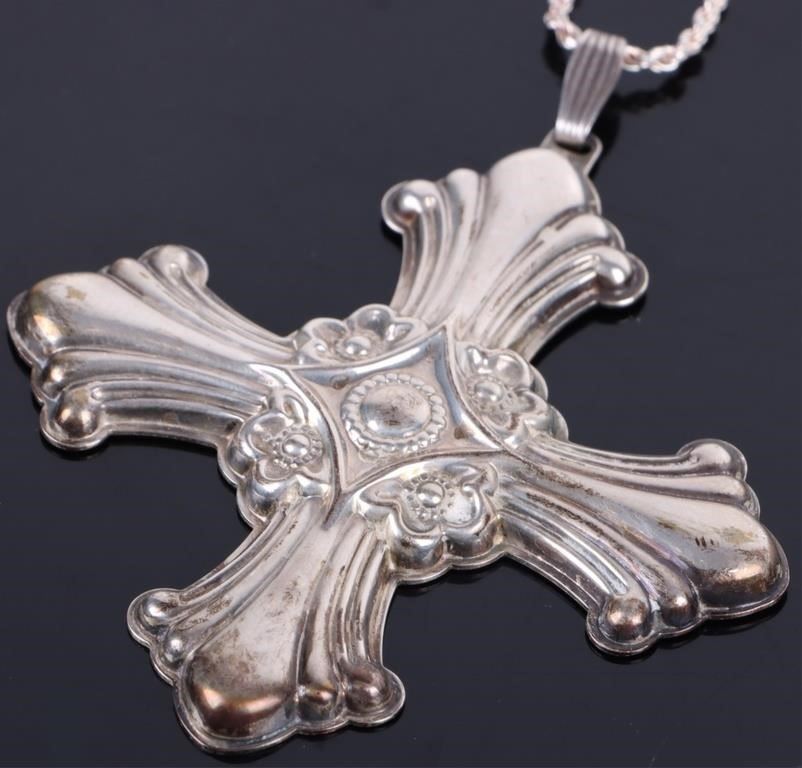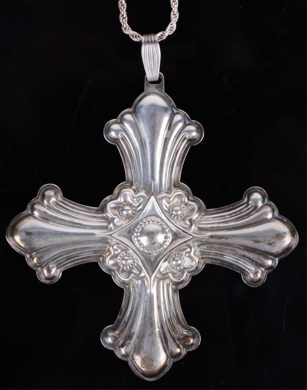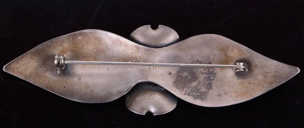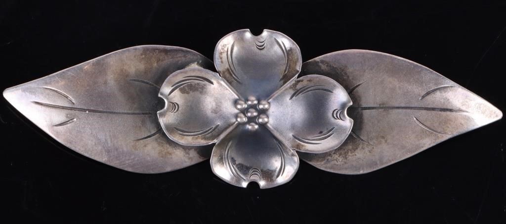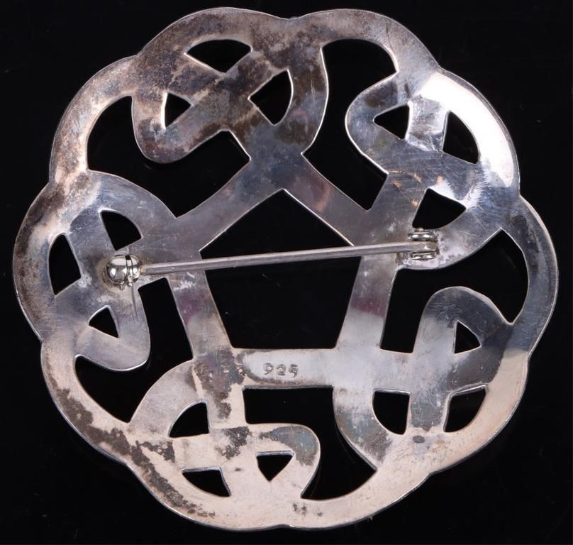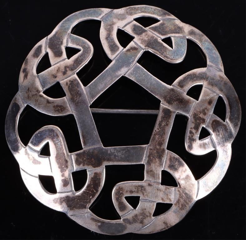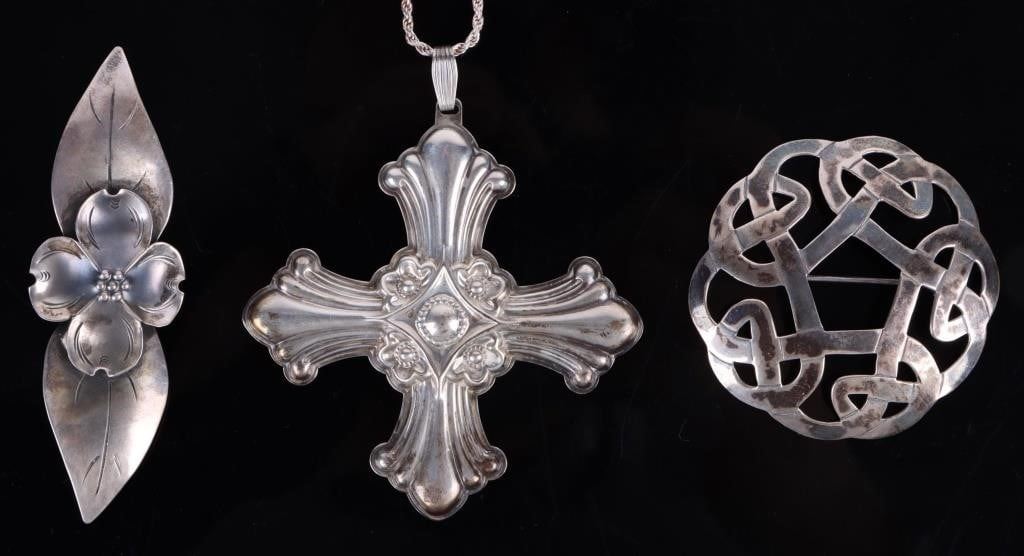 Sterling silver necklace and brooches to include on Reed and Barton sterling silver necklace, one Celtic brooch, and one floral leaf brooch.