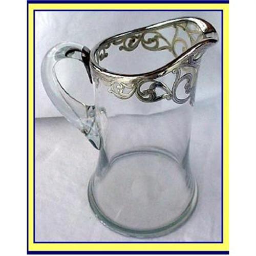 Antique Sterling silver overlaid glass jug / pitcher. American 19th century.<BR>8 inches high. Diameter of base is 5 inches.<BR>Thick glass round base. Slightly tapering body. Sturdy blown handle. The entire upper rim and area below is overlaid with sterling silver engraved scrolling foliage.<BR>A large oval reserve on the front, under the lip, is engraved with an owner from another age's initials: LAC, which add to the charm of the item. <BR>About an inch to the right of the handle is a rubbed engraved STERLING mark and 708. <BR>Condition is excellent. No chips/cracks/damage of any sort.