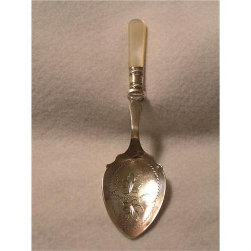 Elegant Victorian sterling silver and mother of pearl jelly spoon. The bowl of the spoon has a lovely engraved floral design on it. The ferule is banded, but plain. Good markings on the back. It measures 6" long.