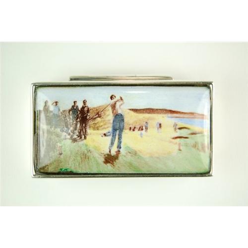 This STERLING Silver Pillbox would be an ideal gift for someone who plays GOLF. It is a Solid STERLING SILVER rectangular pillbox with a lovely painted scene of golfer. The box measures 2" x 1" and is in pristine condition.