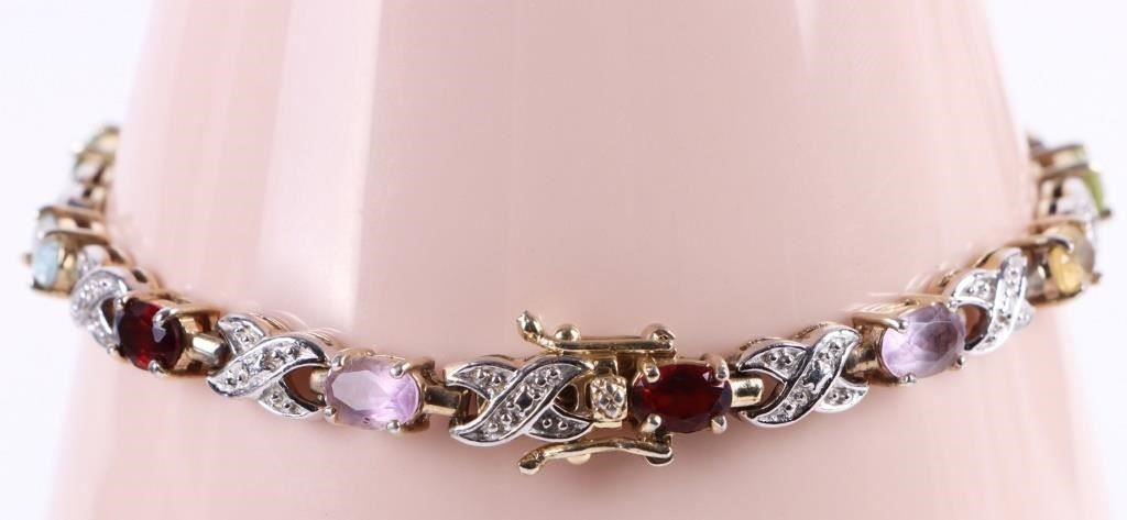 Sterling silver rainbow gemstone ladies bracelet to include peridot, garnet, citrine, amethyst, and topaz.