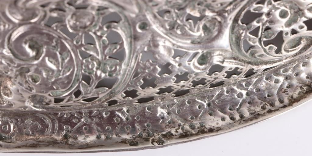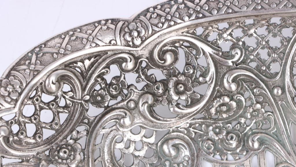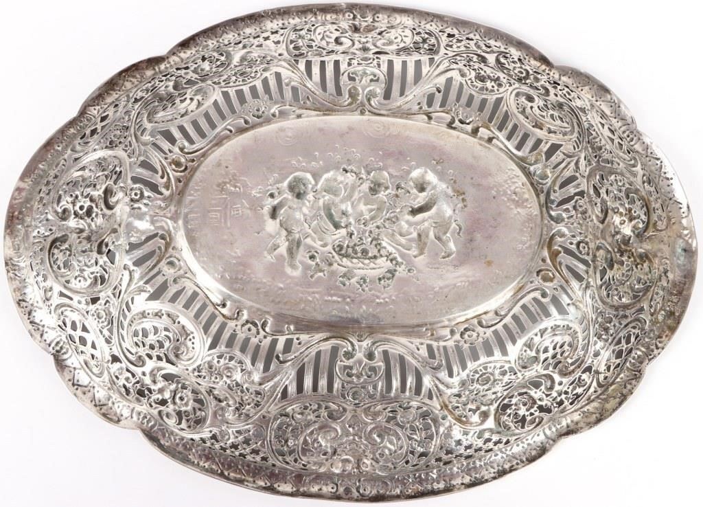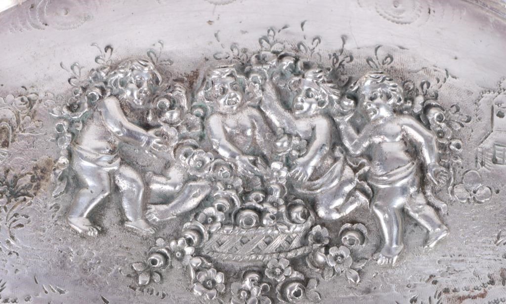 Sterling silver repousse decorative platter to include a unique picture of children and a flower basket.