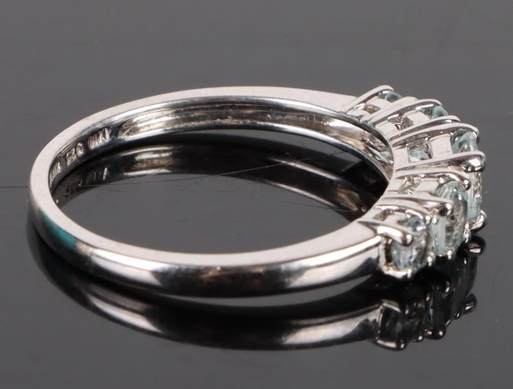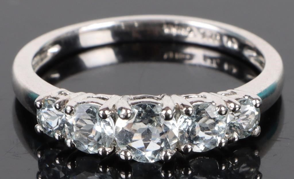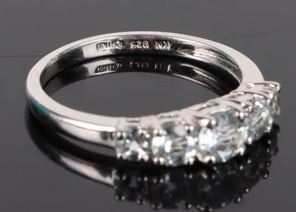 Sterling silver round aqua ladies ring. Gemstones to include two 0.15ct round cut aqua, two 0.25ct round cut aqua, and one 0.50ct round cut aqua gemstone.