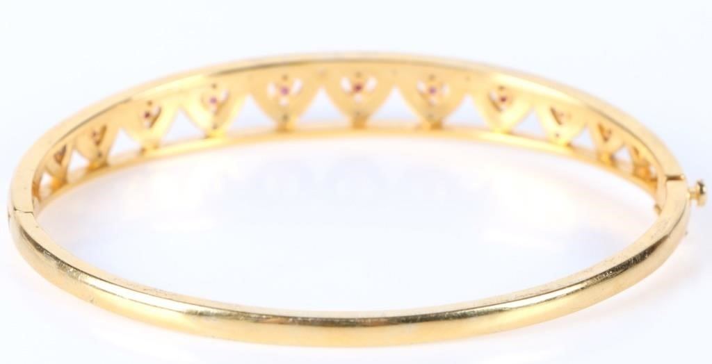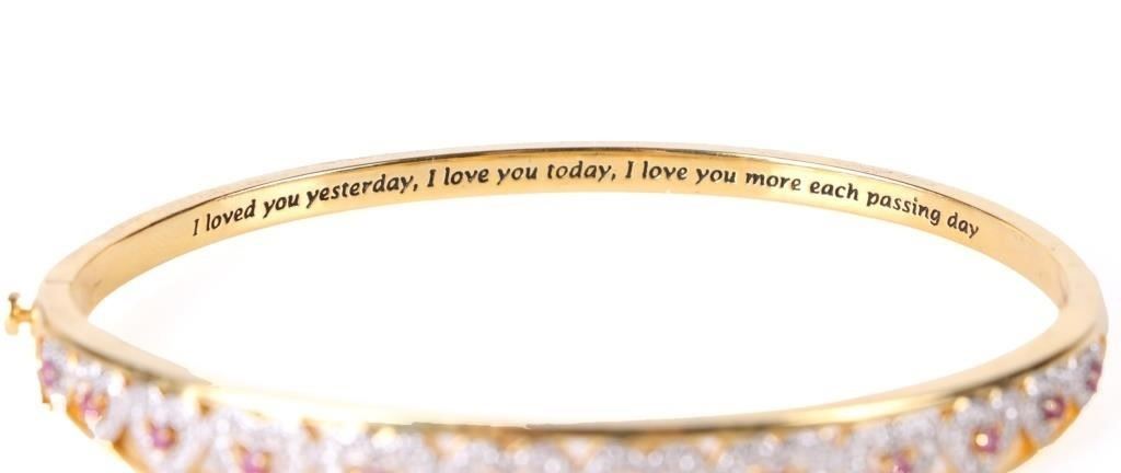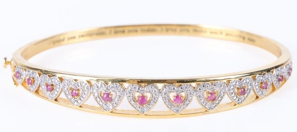 Sterling silver ruby heart ladies bracelet to include the inscription, "I loved you yesterday, I love you today, I love you more each passing day" along the inside of the bracelet. Gemstones to include twelve 0.03ct round cut rubies.