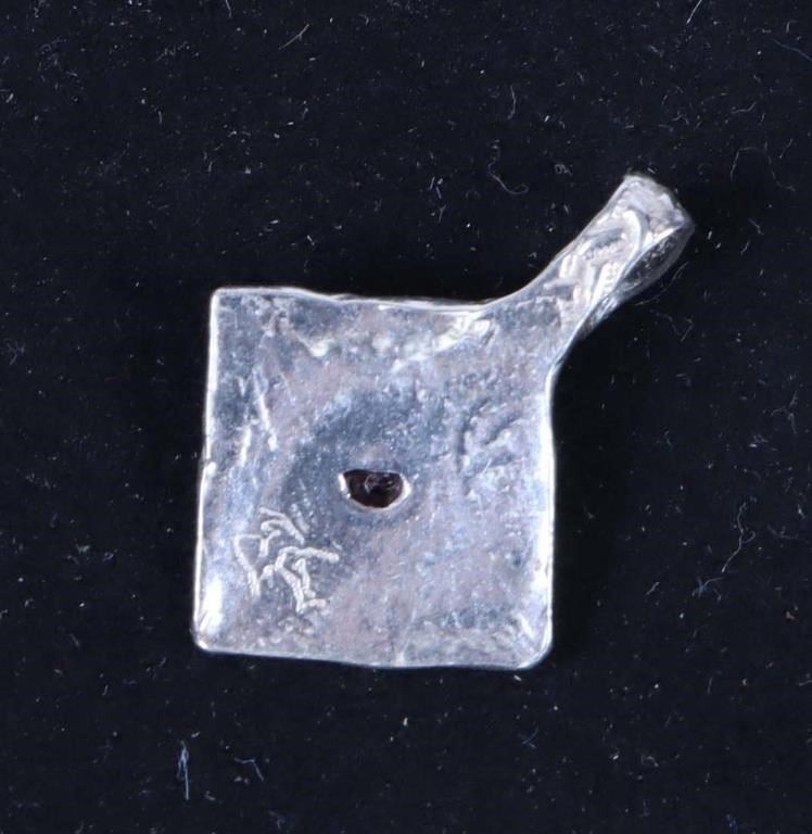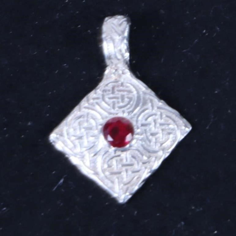 Sterling silver ruby ladies pendant to include one 0.10ct round cut ruby and a beautiful design engraved along the front of pendant.
