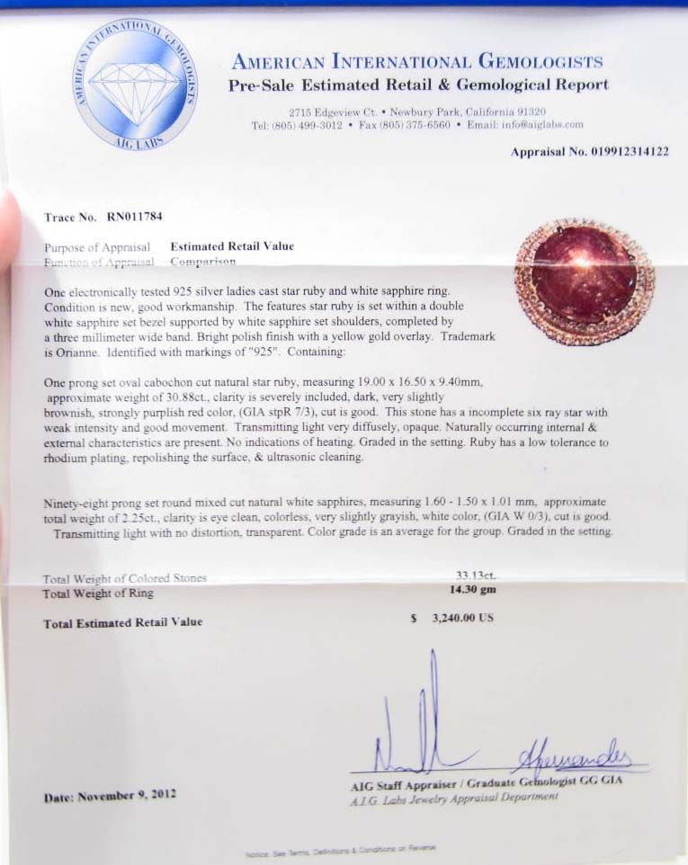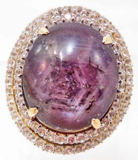 One prong set oval cabochon cut natural Star Ruby center stone 30.88 cts. 98 prong set round mixed cut natural White Sapphires 2.25 cts. Total Weight 14.30 grams. Appraised Value $3,240.00.