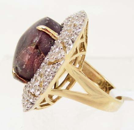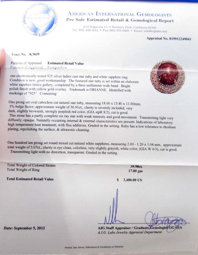 One prong set oval cabochon cut Natural Star Ruby center stone 40.58 cts. 82 prong set round mixed cut natural White Sapphires 1.89 cts. Total Weight 15.63 grams. Appraised Value $3,300.00.