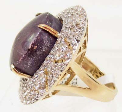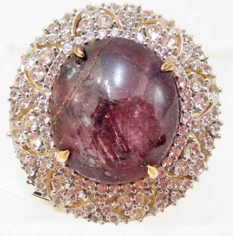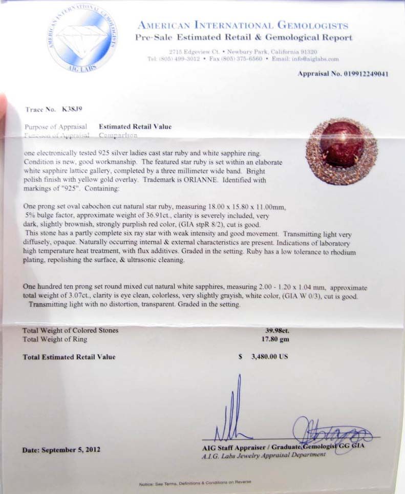 One prong set oval cabochon cut natural Star Ruby center stone 36.91 cts. 110 prong set round mixed cut natural White Sapphires 3.07 cts. Total Weight 17.80 grams. Appraised Value $3,480.00