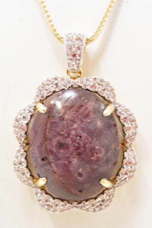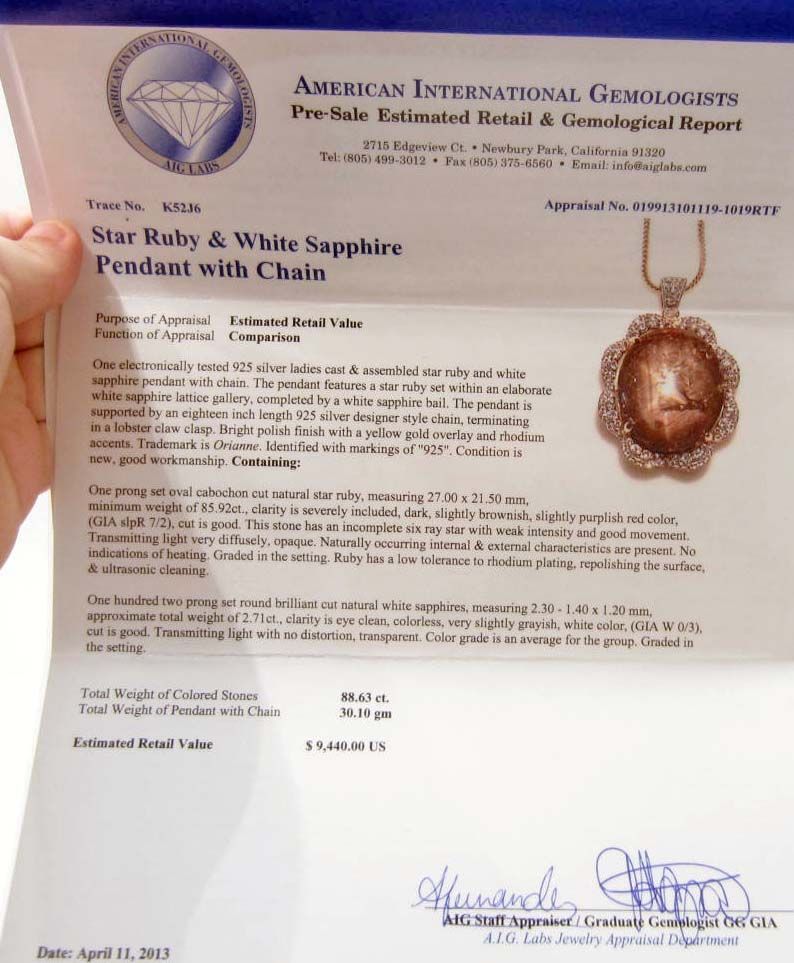 Appraisal of $9,440.00. One prong set Star Ruby center stone 85.92 cts, 102 prong set Sapphires 2.71 cts. Total Weight 30.10 grams.