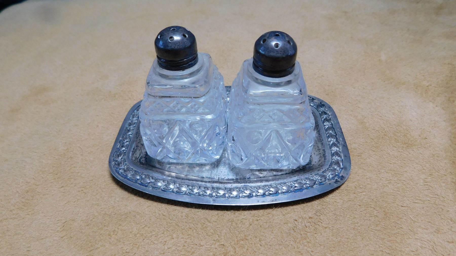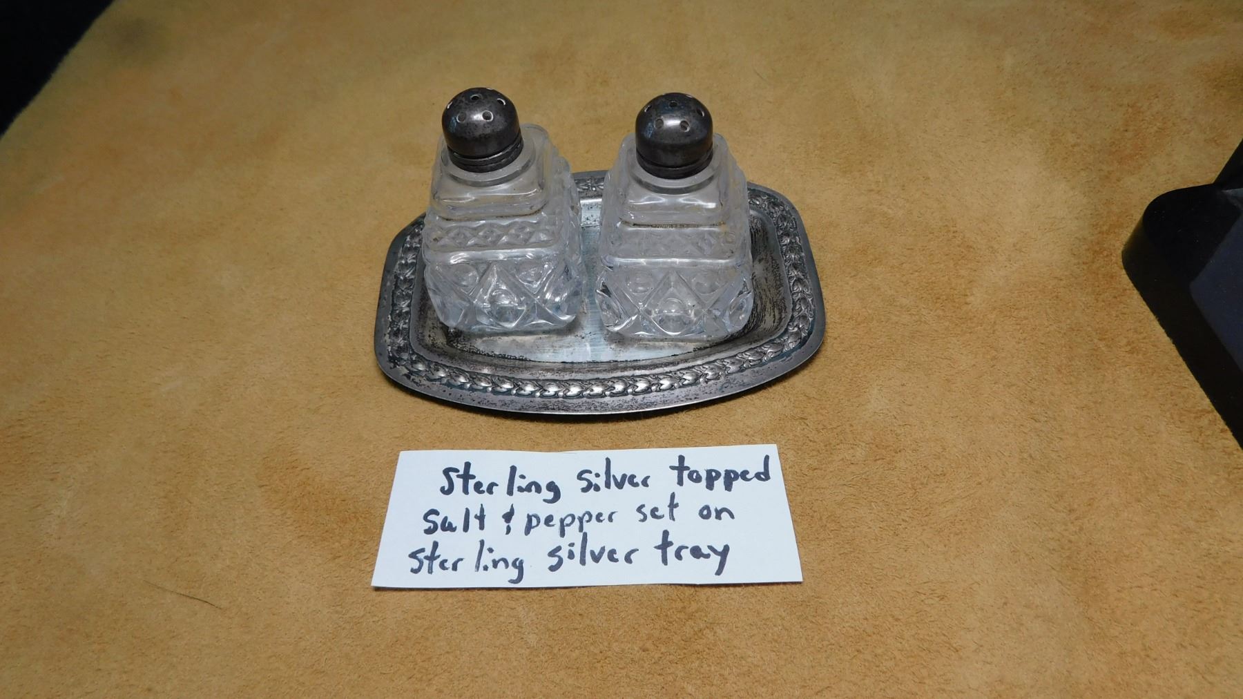 STERLING SILVER TOPPED SALT AND PEPPER, ON A STERLING SILVER TRAY