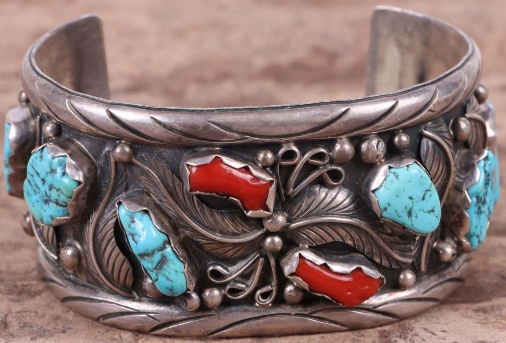 Sterling silver turquoise coral Navajo cuff bracelet to include the name S. Jon engraved in it.