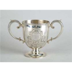 Lot # 1709 STERLING SILVER TWO HANDLED TROPHY CUP. Inscribed “First Prize Annual Pool Tournament University Club of St. Louis April 1st, 1898”. Footed cup has two C-scroll handles, oval presentation area surrounded by cornucopias and crown. Bottom marked “Sterling 2510”. Possibly by New Orleans Silversmiths. WEIGHT: 27 tr. oz. SIZE: 7” h x 11” w. CONDITION: One dime size dent to side, otherwise very good. 9-98183-1 (200-400)