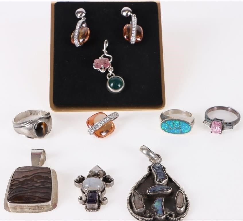 Sterling silver unique collectible ladies jewelry to include four pendants, three rings, and one matching set.