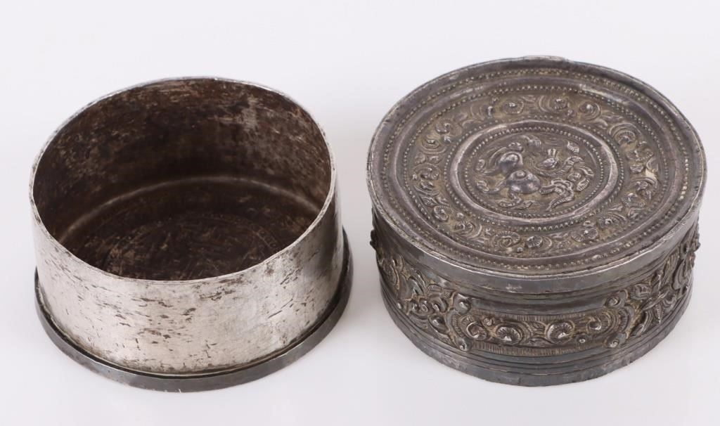 Handcrafted vintage sterling silver Asian container that depicts intricately carved designs which would make a perfect addition to any collection of Asian culture.