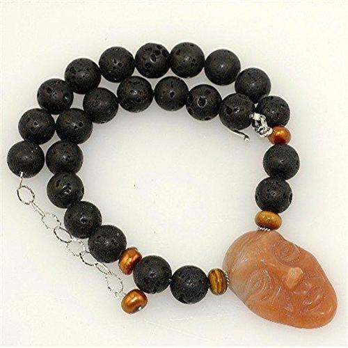 <p>Necklace features volcanic lava beads and a carved jade face pendant.