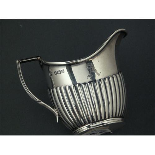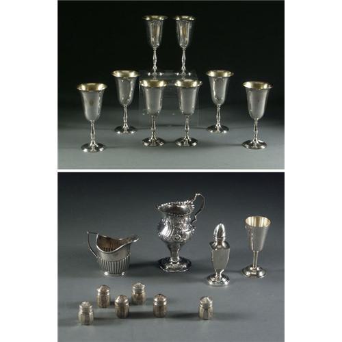 STERLING: Assorted lot sterling including eight American wine goblets with gold wash at interior 7.75'' H, unidentified hallmark; a sterling footed, hammered, embossed creamer 4'' H, with a London 1811 hallmark (note extensive damage at lip); a Mexican sterling cordial by P. Lopez, 3'' H; Sheffield sterling creamer hallmarked 1936, monogrammed ''A'', 2 3/4:'' H x «'' L, six individual sterling salts 1¬''; one sterling table salt shaker. Note: One minor dent in lip of a goblet, the tip end of the footed creamer is missing, minor dents on the individual salts, 58.0 Toz. est., excludes Mexican sterling.