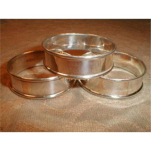 Pretty set of three sterling silver napkin rings. Round bands with rolled rims. Although made by different makers; they are practically identical. No monograms.