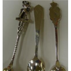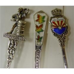 Sterling silver demitasse size souvenir spoons. Lot of 3. One stamped "Virgin Islands", one with a maple leaves struck "Canada" on handle and engraved "Winnipeg" on bowl and the third with enamel shield says "Arizona" and is marked "Sterling 925/Kleparts German". Condition: Very Good